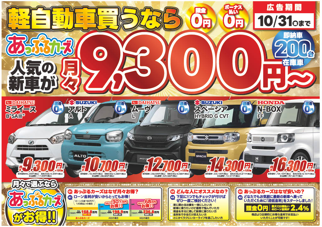 頭金0円、ボーナス払い0円、最大120回払いのローンの金利がなんと、2.4%!ディーラーよりも圧倒的にお得な金利でお支払いいただくことが可能です。しかも、購入後も何かとお得な特典が満載!富山最大級の売り場面積を誇るあっぷるカーズには、人気の軽自動車、ミニバン、SUVが並んでいますので、ご来店いただければいつでも自動車をご覧いただけます!